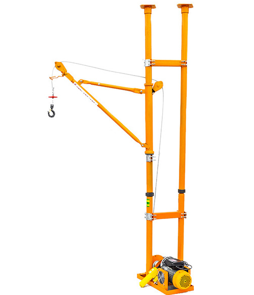 負(fù)責(zé)施工的工作人員在吊大玻璃時(shí)會(huì)事先在業(yè)主室內(nèi)固定一個(gè)小型的室內(nèi)吊運(yùn)機(jī),吊運(yùn)機(jī)的頂桿頂在房頂上,底座直接和地面接觸,借助著房頂和地面之間的夾持力使其保持穩(wěn)固狀態(tài),同時(shí),在電機(jī)的啟動(dòng)下就能利用鋼絲繩把樓下的玻璃吊裝到指定安裝位置。